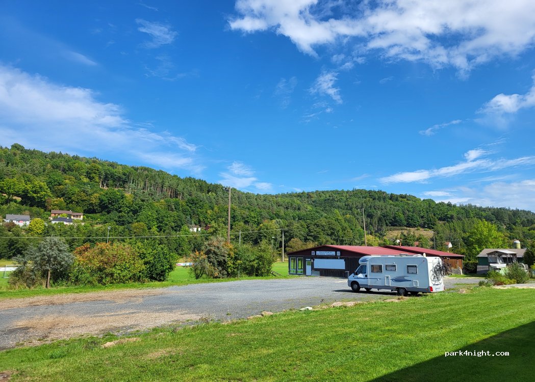 Place de parking sur le terrain de sport avec colonne électrique (3 connexions) y compris évacuation de l'eau et des toilettes. Le Rhönexpress Bahnradweg est juste à côté. La boîte de dons est clairement visible avec une fente.