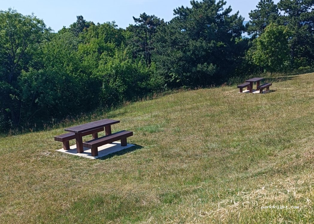 Nice spot to spend a night. Loads of bins, picnic tables and a fresh water spring down the hill (not suitable to fill up anything though). There is an abandoned golf course close by where you can walk. Until late at night there were a few other cars and people getting in/out of their cars, walking around and talking loudly. Nobody bothered us though. Lovely view over the Balaton