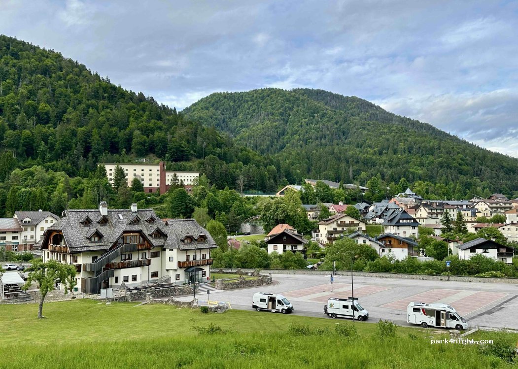 Místo se nachází kousek od hotelu Tarvisio přes cestu.Klidne a čisté místo s mnoha parkovacími místy. Spali jsme jednu noc a bez problémů. Bylo zde zaparkováno kolem 15 karavanů a 3 auta.