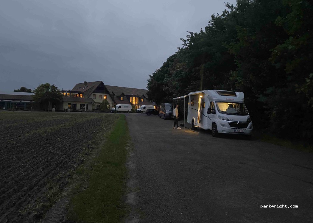 An einem Parkstreifen auf Schotter umgeben von Feldern, einem Bauernhof und einem Restaurant. Der Betreiber freut sich über einen Restaurantbesuch und die Toiletten können zu den Öffnungszeiten kostenlos genutzt werden.