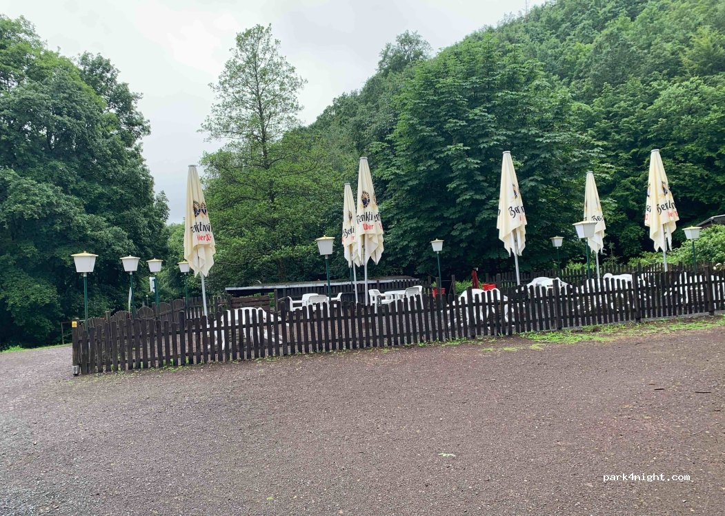 Parking lot in the Rhine-Westerwald Nature Park directly at the reservoir. Highly frequented by walkers, runners and hikers during the day. No prohibition signs. The parking lot is located directly on the Rheinsteig and on the Oberbieber circular route. In the immediate vicinity of the riding arena and the Limes with a replica watchtower. Access through the narrow streets of the Neuwied district of Oberbieber is not very suitable for mobile homes. Ideal for box vans and camper vans. At night only the rustling of the nearby Aubache can be heard. There is a trash can next to the wooden bench at the entrance.