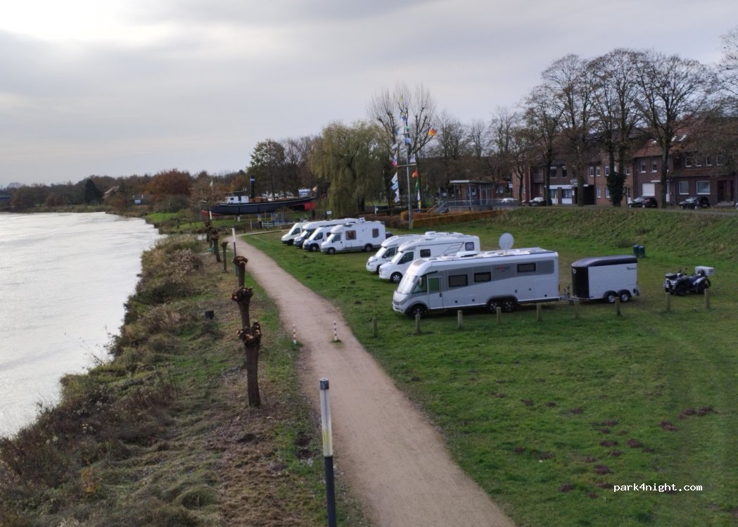 Schöner kostenloser Stellplatz mit Blick auf die Ems. Zu Fuß ist man in wenigen Minuten im Ort mit Restaurants und Einkaufsmöglichkeiten.