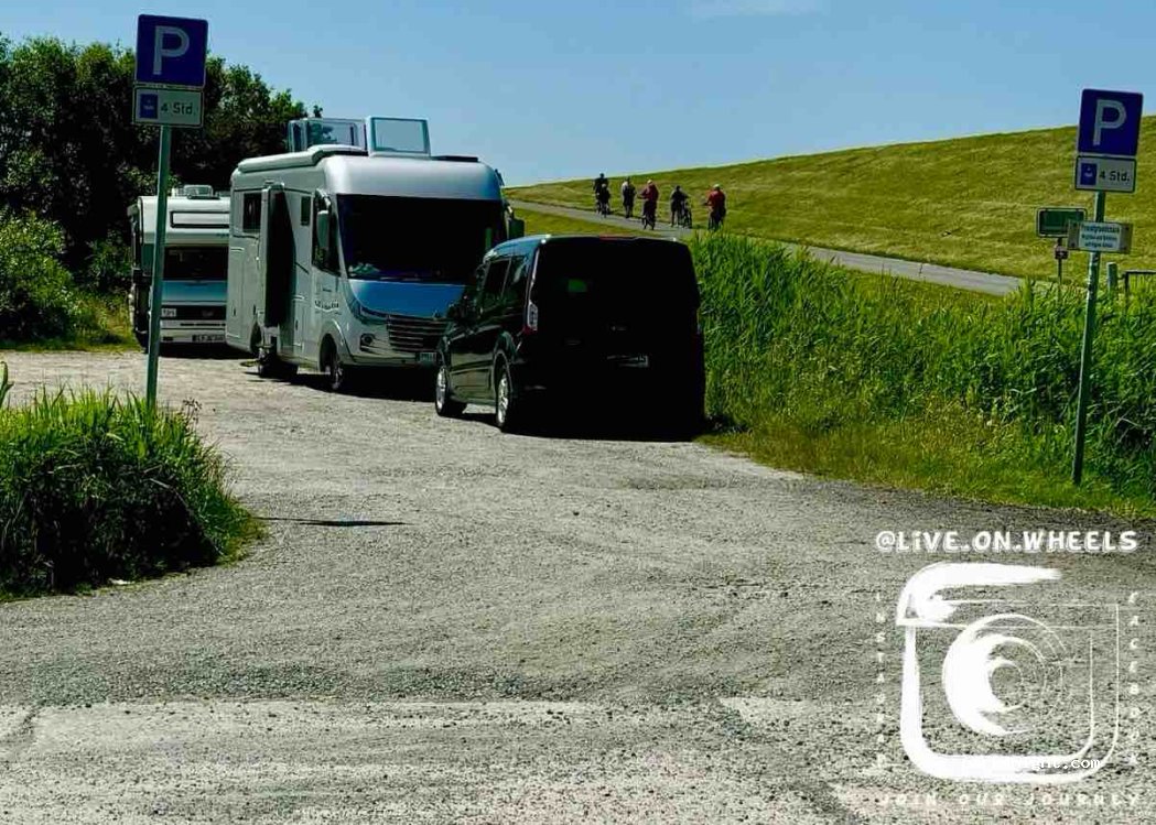Schöner Platz für bis zu 4 Stunden (mit Parkausweis). Toller Platz zum Windsurfen/Kitesurfen. Flach und geschottert. 4G Internet (Vodafone). Ideal für Spaziergänge auf dem Deich. Bitte hinterlassen Sie das Gelände sauber und nehmen Sie Ihren Müll wieder mit.