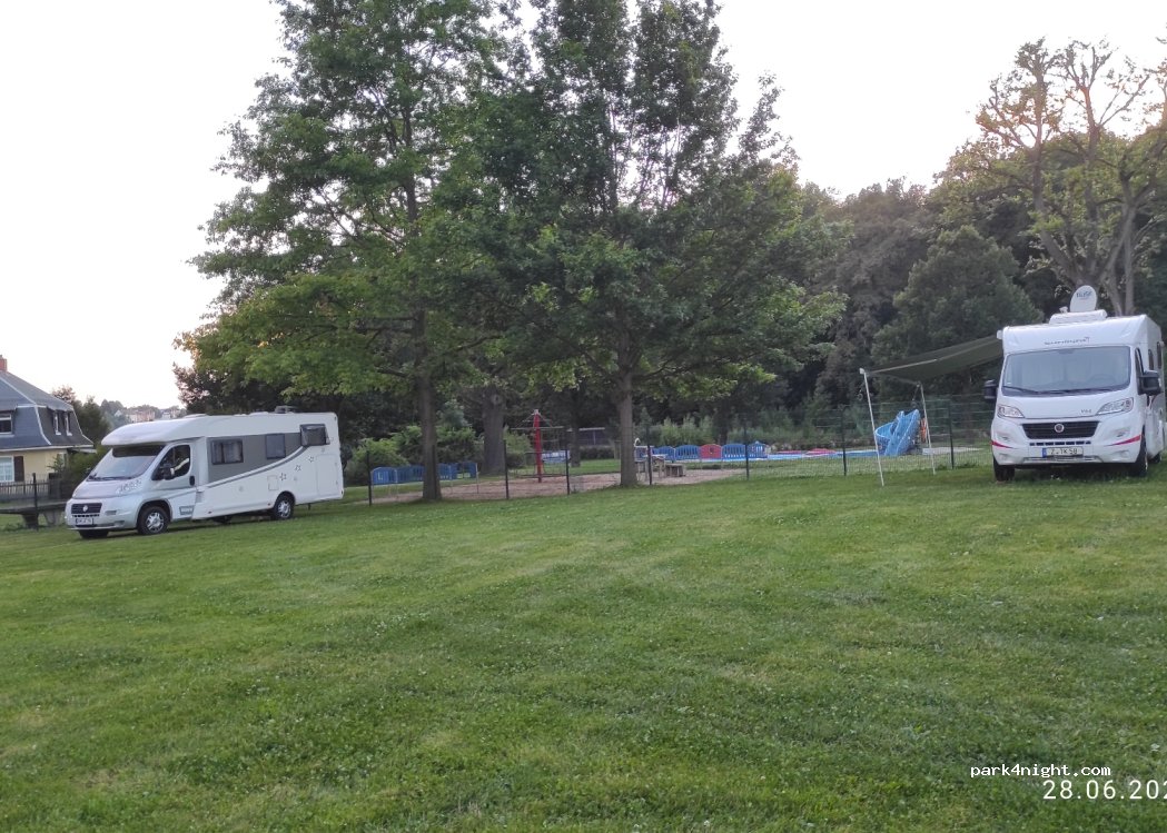 According to the internet parking space for 3 mobile homes, but also space for more (possibly 6). Grounds belong to the swimming pool, best to call them, the lifeguard will bring the key for the gate and the toilet & shower room. Overnight stay incl. electricity, toilet and shower. Key deposit. Ideal for van drivers who need a shower, toilet, electricity and drinking water again. Great bakery around the corner, all discount stores and the well-kept city center are easily accessible by bike.
