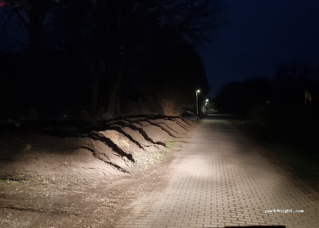 Parking lane at a dead-end sports field, right on a cycle path. No supply and disposal lights at night. Very quiet area.