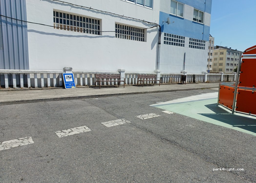 Vaciado grises y negras. Agua potable gratuita. Pueden vaciar grises 2 autos a la vez. Para dormir solo hay dos plazas. Sin sombra. Céntrico. Solo hice descarga pero por la noche es un sitio tranquilo