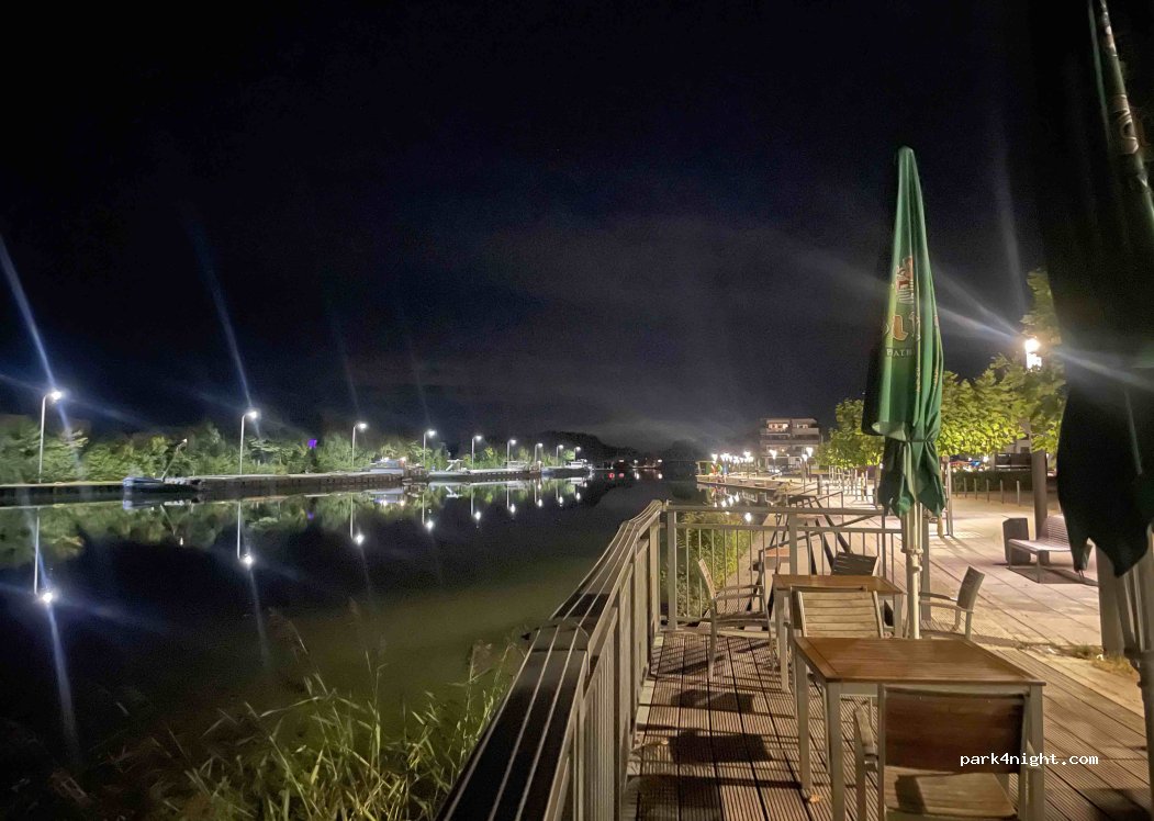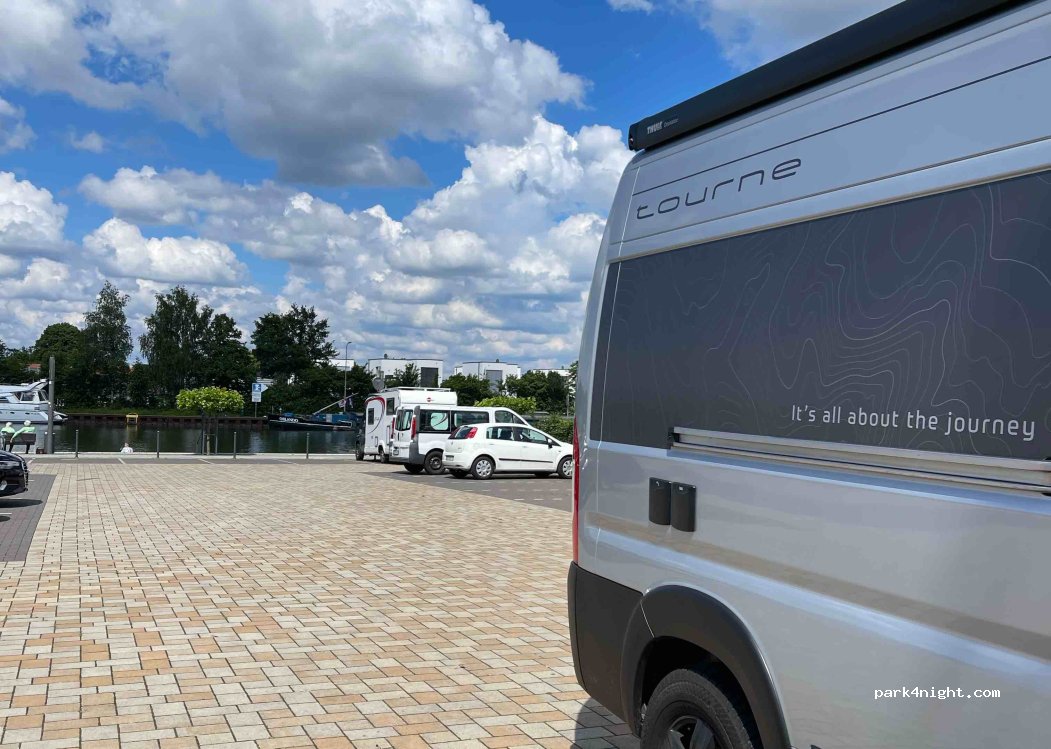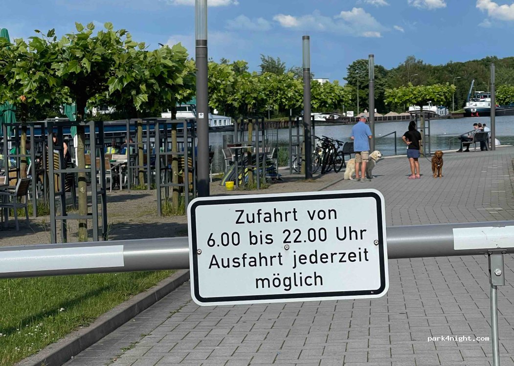 Zufahrt ist über eine automatische Schranke von 6-22h möglich. Ausfahrt jederzeit möglich. Standen dort nicht über Nacht, da wir vermuten, dass es durch die Straße und Bahnschienen direkt nebenan laut sein kann. Parkplatz zum die Stadt zu besuchen oder für eine Pause am Kanal super.