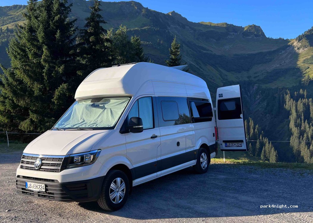Geschotterter Platz, leicht schräg. Sehr ruhig! Nachts fährt kaum jemand auf der Straße. Mega-Ausblick. Am 30.06. waren große Teile des Platzes mit Baumaterial belegt, aber 2 Womos hatten Platz.