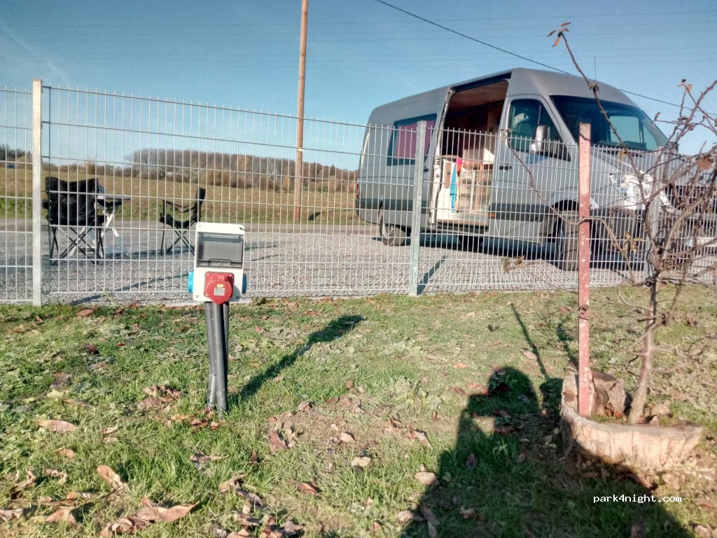 Nach einer längeren Fahrt, sehr guter Platz zum ausruhen und übernachten. Auf kleines Schild „Park4night“ am Zaun achten. Stellplätze vor dem Zaun auf dem Kies.