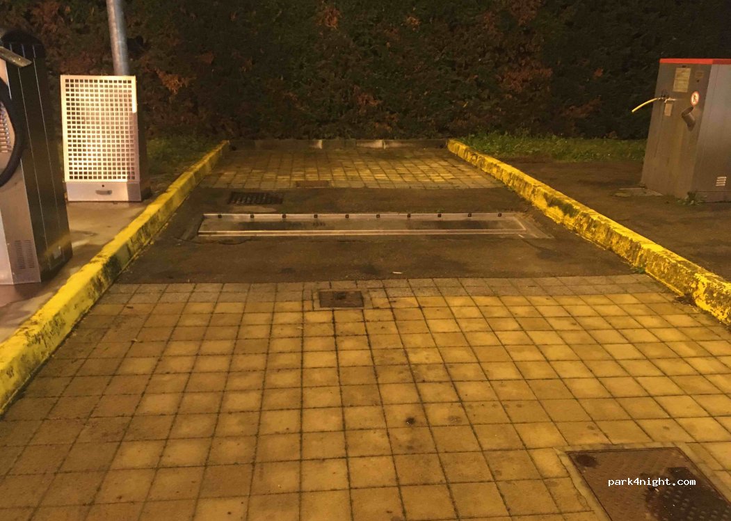 In der Tankstelle an der Seite Autowäsche Grau und Schwarz abflussfrei. Laden Sie 10 Cent pro 10 Liter. Sogar große Camper waschen. . Abends beleuchtet.