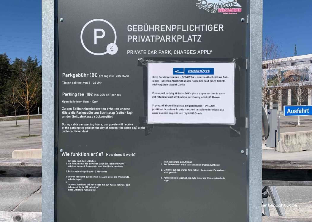 Kostet 10€ die man bei Nutzung der Bergbahn am gleichen Tag zurück erstattet bekommt. Ist direkt an der Straße . Schönes Bergpanorama.