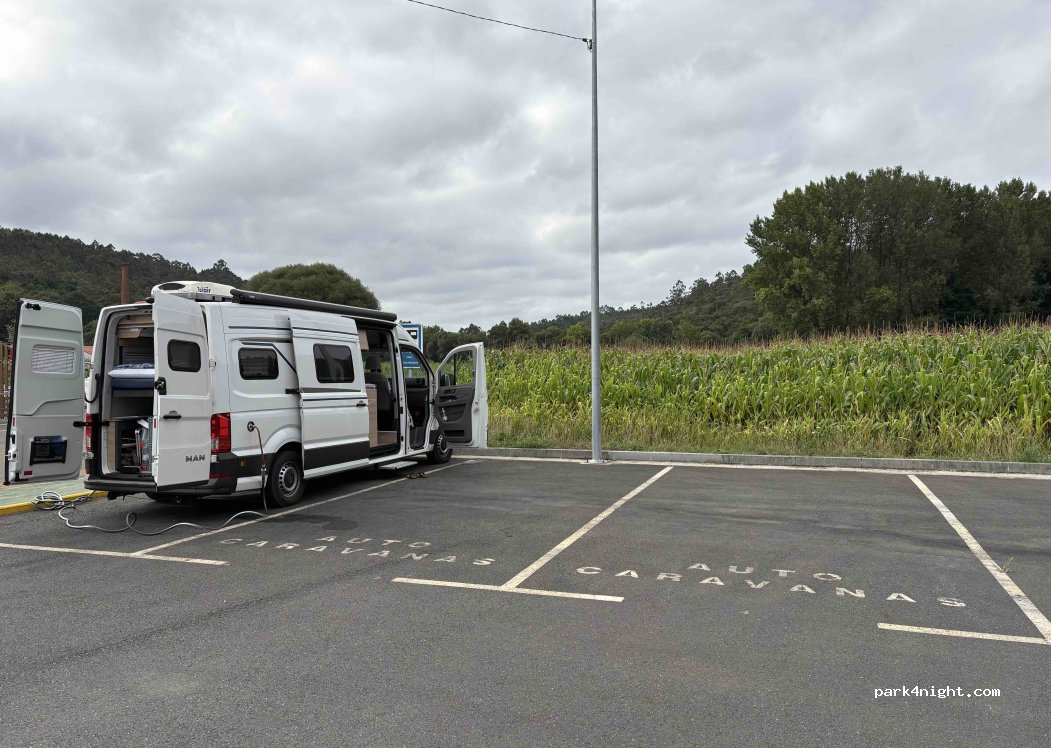 Además de todo lo comentado por los compañeros añadir que en el edificio gris de casi en frente (polideportivo) hay baños con duchas de agua caliente de lunes a viernes para los que pernocten en el área. Consultado en el Ayto. y confirmado con el alcalde. Consumamos en el pueblo (en restaurante "A Ras" tienen un rico menú a buen precio). Muchas gracias por este estupendo área.
