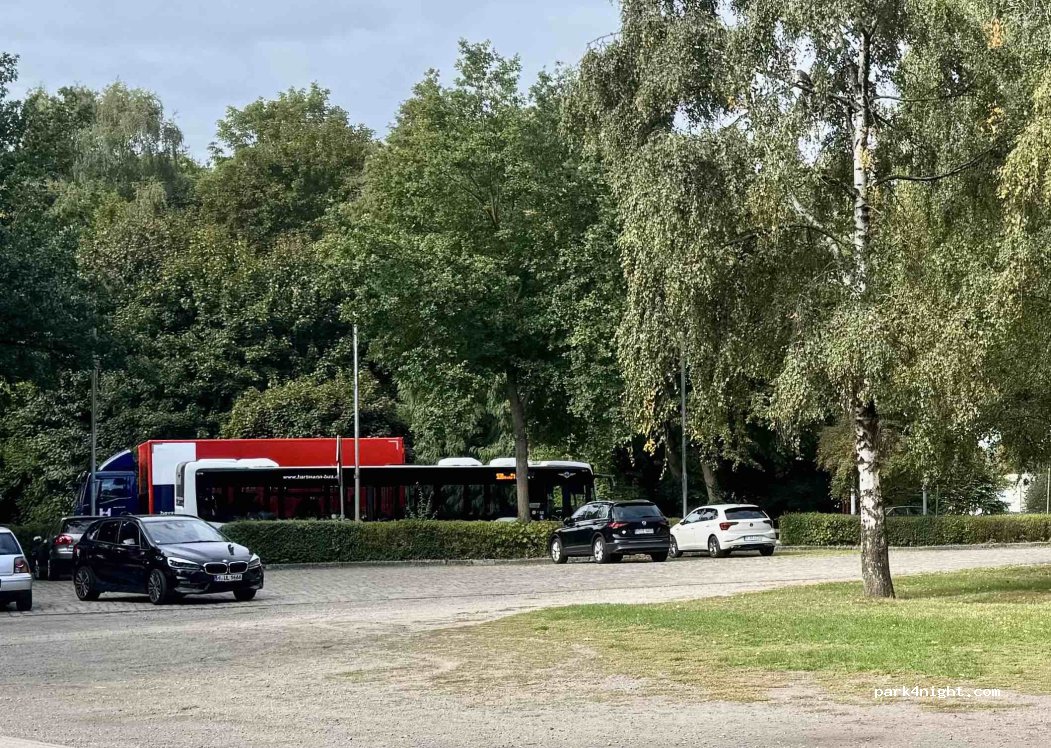 Simple, pretty parking lot up to 2.8 t: the old horse market. Opposite the market square, maybe a little quieter than that. Gravel, partly paved, mostly flat. There is a supermarket next door. Walking and Bike path directly on the floodplain.