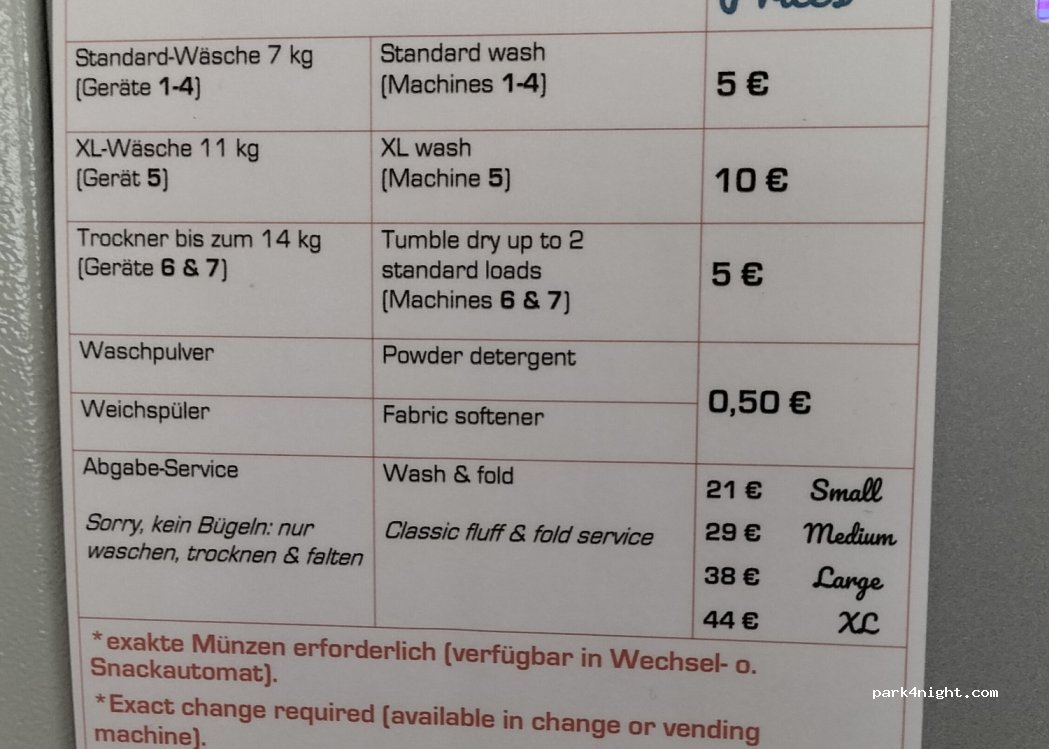 Saubere Maschinen, sauberer Aufenthaltsraum mit ausreichend Sitzgelegenheiten. WLAN funktioniert prima. 1 Waschgang 41 Min ohne Vorwäsche für 4€/8€. 1 Trockengang 30 Min für 4€. Wir hatten unser eigenes Waschmittel mit, was man auch verwenden konnte. 365 Tage von 8-20:30 geöffnet. Gerne wieder!