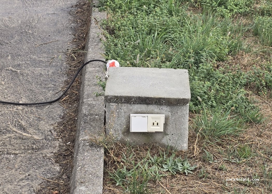 Área muy tranquila con electricidad gratis, buena cobertura móvil y basuras. Hay cancha de baloncesto y de pádel de uso gratuito también. Al lado de la carretera pero no hay mucho ruido de coches. Uno de los 8 enchufes está roto pero el resto funcionan perfectamente.