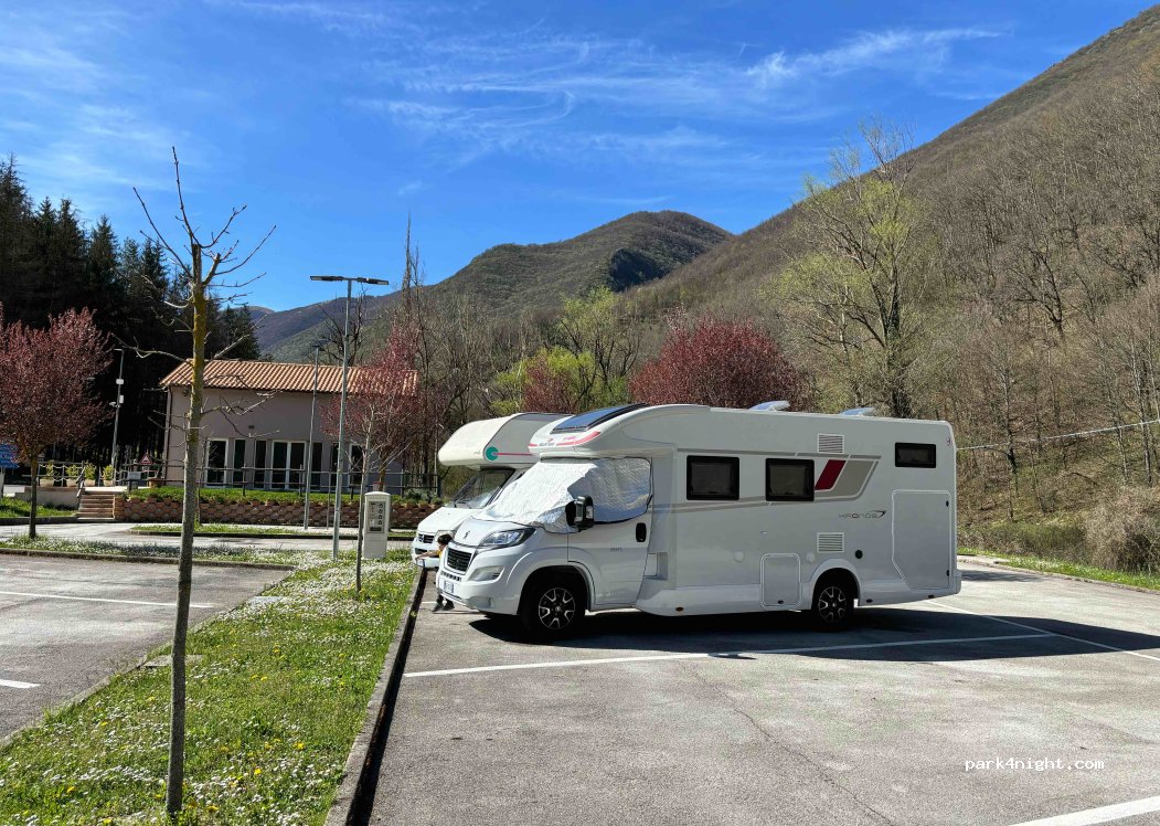 Area nuova, più vicina dell'altra appena più in alto. Servizi carico e scarico comodissimi. Ombra scarseggiante. Tranquilla e pianeggiante. A due passi dal centro e dal bar e alimentari con prodotti tipici. Da non perdere le sorgenti del nera e l'area picnic con barbecue appena fuori il paese di fianco al fiume. Comoda per passeggiate all'aria aperta. Grazie per la messa a disposizione.