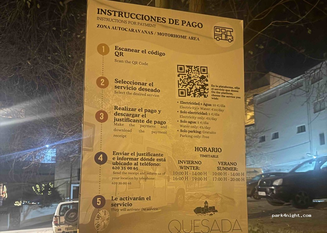 Paga la luz y/o el agua escaneando el código QR o visitando la página web del ayuntamiento. Tras el pago, usa WhatsApp para activar los servicios. Hay un parque municipal de autocaravanas en Quesada. Un pueblo agradable con todos los servicios, museo, rutas de senderismo, bares, panaderías y una gasolinera a 100 metros. A la entrada del pueblo, preciosas vistas de la Sierra y Los Olivares.