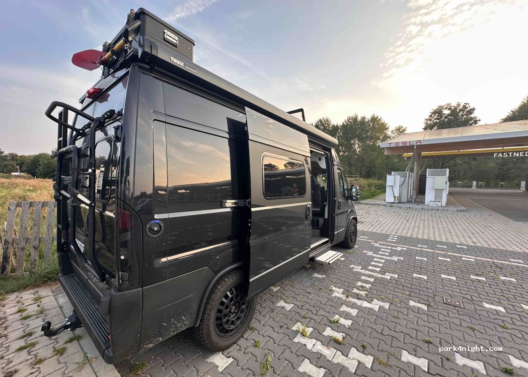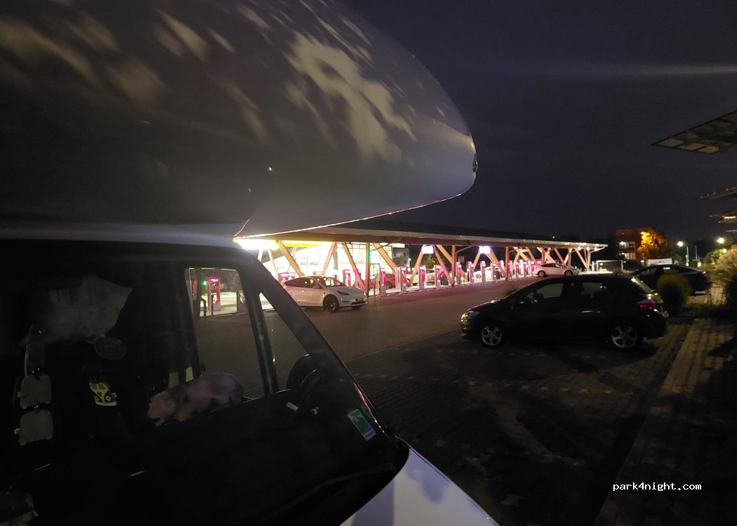 Charging park for electric vehicles. Enough space for mobile homes. Right on the motorway, therefore ideal for overnight stays. Very good baker on site. Please do not block any charging stations