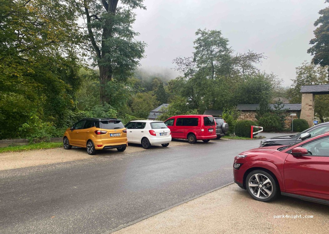 Sehr schöner, sauberer und ab 19:00 ruhiger (man hört den Eberbach) Parkplatz. Nachts mit einigen Laternen beleuchtet. Ab 9:30 kommen dann die Klosterbesucher. Wenn das stört besser am Anfang und nicht vorne am Zugang zum Kloster Parken.
