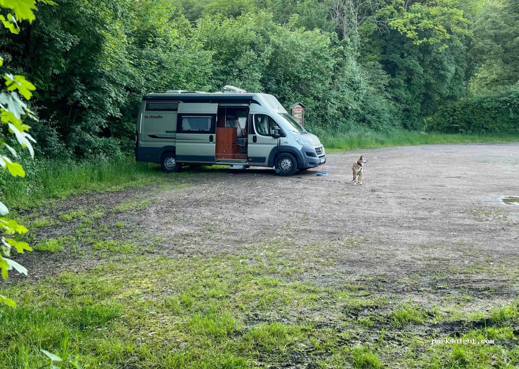 Easy gravel parking lot. A little further up there is a barbecue area. The parking lot is mainly used by walkers. At night only the federal road opposite could be a problem. However not very busy at night.