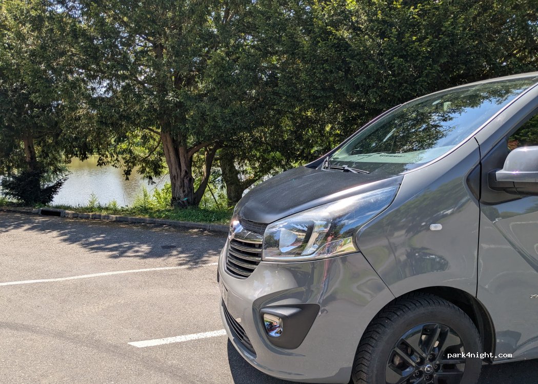 Free parking day and night. Possibility to park along the road. Lake below. Trade nearby including restaurant and municipal swimming pool. Ideal out of season, camping nearby.