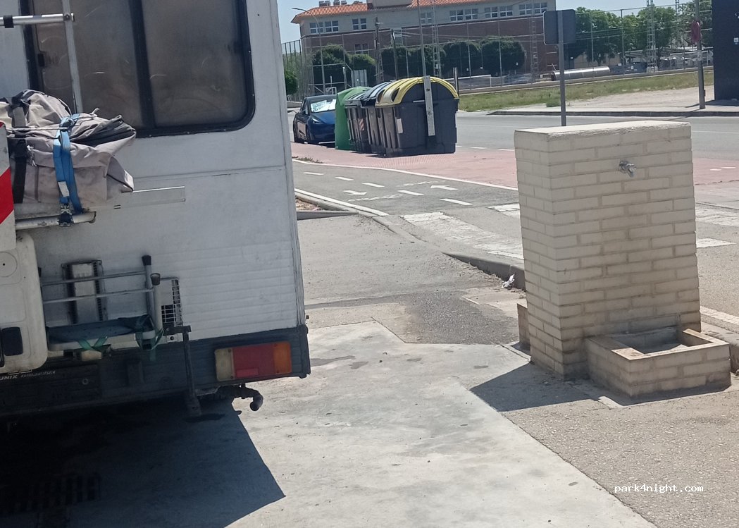 The locals park their cars despite the signs for Autocaravans so arrive in the afternoon or after 10 pm when people leave the arenas. Good service for black and grey water and fresh water . We had a problem with our refridgirator in the van and Wera helpension out by electronic service MARCO herre in Las Torres de Cantilla -thank you Roberto.