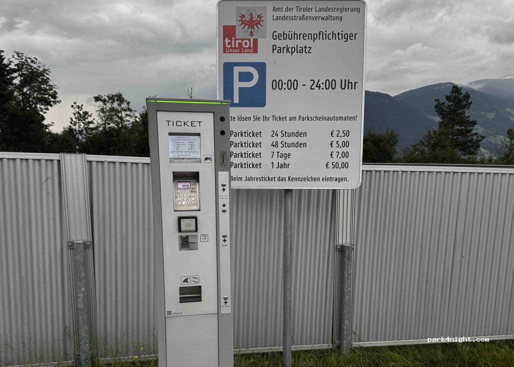 Un endroit pour passer la nuit qui fait son office. Parking goudronné légèrement en pente. Il y a certes le bruit de l'autoroute et de la voie express à côté mais nous avons bien dormi. 2€50, c'est imbattable pour la tranquillité nocturne au Tyrol.