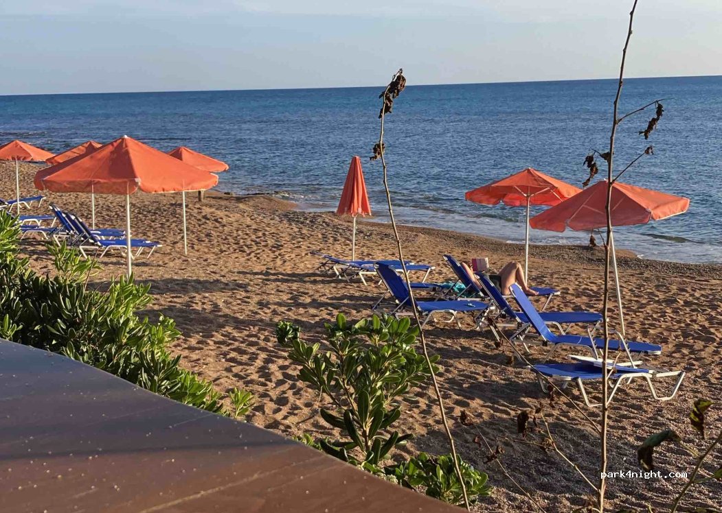 Extrem schöner und gut gewarteter Platz. Man spricht Deutsch. Punktabzug: Undurchsichtige Preispolitik. Preise von Website und Aushang sind falsch. €27 f. 2 Erwachsene im Camper mit ADAC/Asci. Überwiegend Deutsche Gäste, die leider auch die Stimmung aus Deutschland mitbringen; nicht ungewöhnlich in GR. Im April 2025 bestand der Strand aus Steinen und etwas Kies. Sandstrand gibt’s 1,7km östlich.