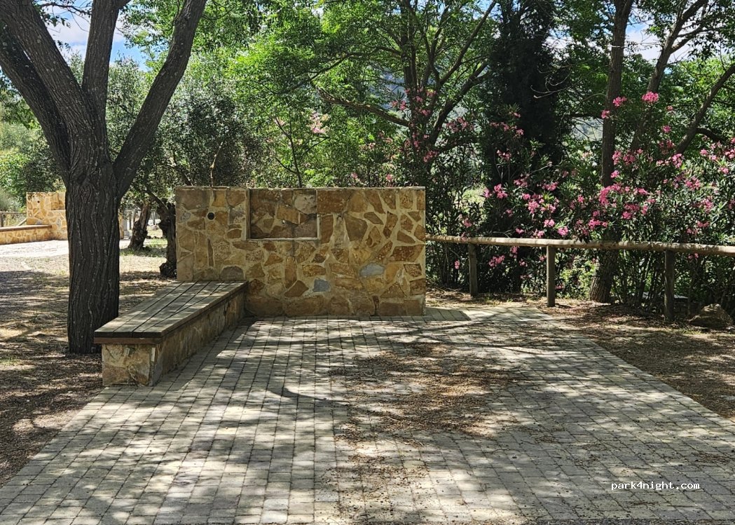 Kostenloser schattiger Parkplatz und kostenlose Dienstleistungen. Jeder der 5 Stellplätze hat eine ebene befestigte Oberfläche, mit einer zentralen Rinne für die Abwasserentsorgung. Auf der Rückseite des Geländes ein technisches Mäuerchen mit Ableitung für Schwarzwasser, Waschbecken mit Trinkwasseranschluss und einer Steckdose. An der Seite jeder Seite ein niedriger Wandsitz mit Holzsitz. Die Hähne sind selbstschließend und gewindelos.
