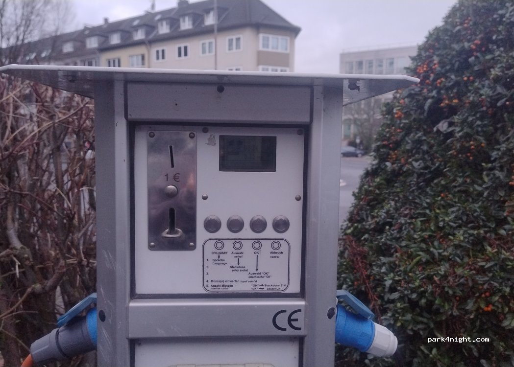 Es ist nur ein Parkplatz, etwas schräg, nicht schön, aber zentral gelegen und in der Nacht ruhig. Zur Stromversorgung: Als ich ankam, war der Münzeinwurf mit „Defekt“ überklebt, doch das stimmte nicht! Es waren nur ein paar Sicherungen herausgesprungen, nach dem Hochklappen funktionierte alles wieder.