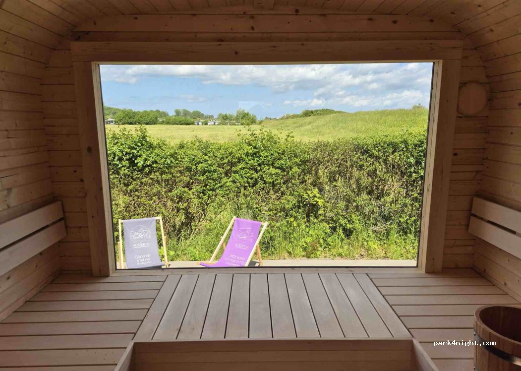 The campsite is located directly behind the dike and is relatively small and very close to nature. You won't find any 24-hour entertainment here, but you will find peace, relaxation, and a focus on sustainability. Pitches can be reserved in advance via the website, or you can simply drop by and see if there's a spot available. They're for campervans up to 7 meters in length. For those without their own campervan or caravan, the campsite also offers tiny houses, rental caravans, and glamping tents, which can be booked online. There's also a panoramic sauna with its own private garden, which can be booked. During winter camping, service is severely limited, with no washroom, and reservations can only be made online.