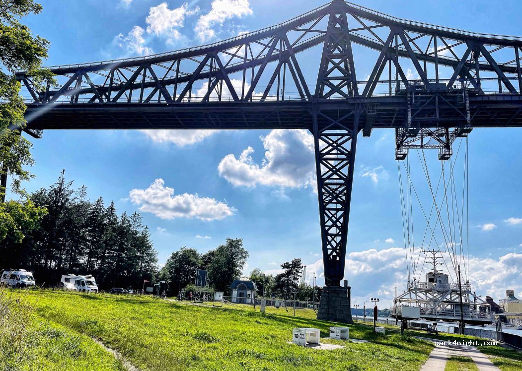 Nice place to stop to see this unique bridge and ferry but not great for overnight. Very small area, quite noisy and people are not parked very well. Do not approach from Fährstraße as the road is closed.