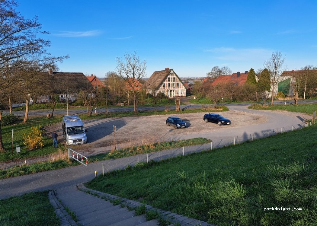 Parkplatz, von Spaziergängern gern benutzt. Direkt an der Straße, ab dem späten Abend ist der Lärmpegel akzeptabel. Super Blick vom Deich auf die Elbe.