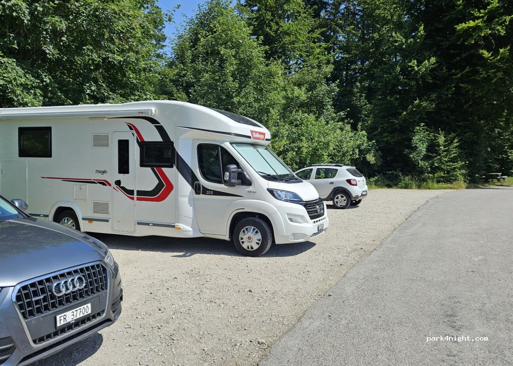 Très jolie place pour une nuit, il s'agit d'un parking pour les randonneurs donc beaucoup de voitures s'y garent. Très belle vue sur Romont, places à plat, table de pique-nique, 15min à pieds des toilettes publiques de l'autre côté de la forêt.
