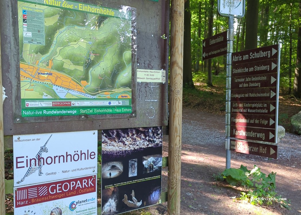Parkplatz an der Einhornhöhle. Großer Parkplatz im Wald . Parkmöglichkeit von 6-20Uhr. Gute Zufahrt über befestigte Straße. Sitzmöglichkeiten , Holzbänke und Holztische vorhanden. Wir waren mit unserem Wohnmobil 7m dort.