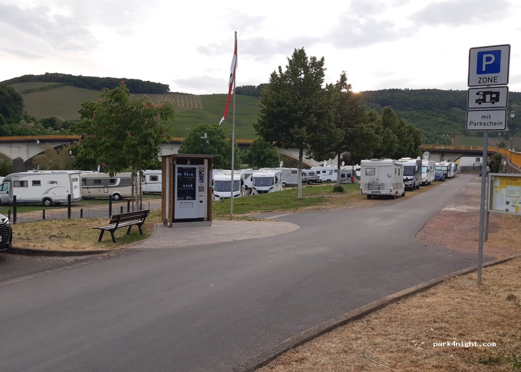 Sehr schöner Stellplatz direkt an der Mosel. Geräumige Terrassenförmig angelegte Stellpätze. Sehr gut für Radfahrer und Hundebesitzer geeignet. Restaurants und Winzer sind fußläufig in ein paar Minuten erreichbar! Bezahlt wird der Stellplatz mit einem Ticket aus dem Automaten, 10€ inclusive Strom. Ver- und Entsorgung funktional und leicht anzufahren. Insgesamt sehr empfehlenswert!!