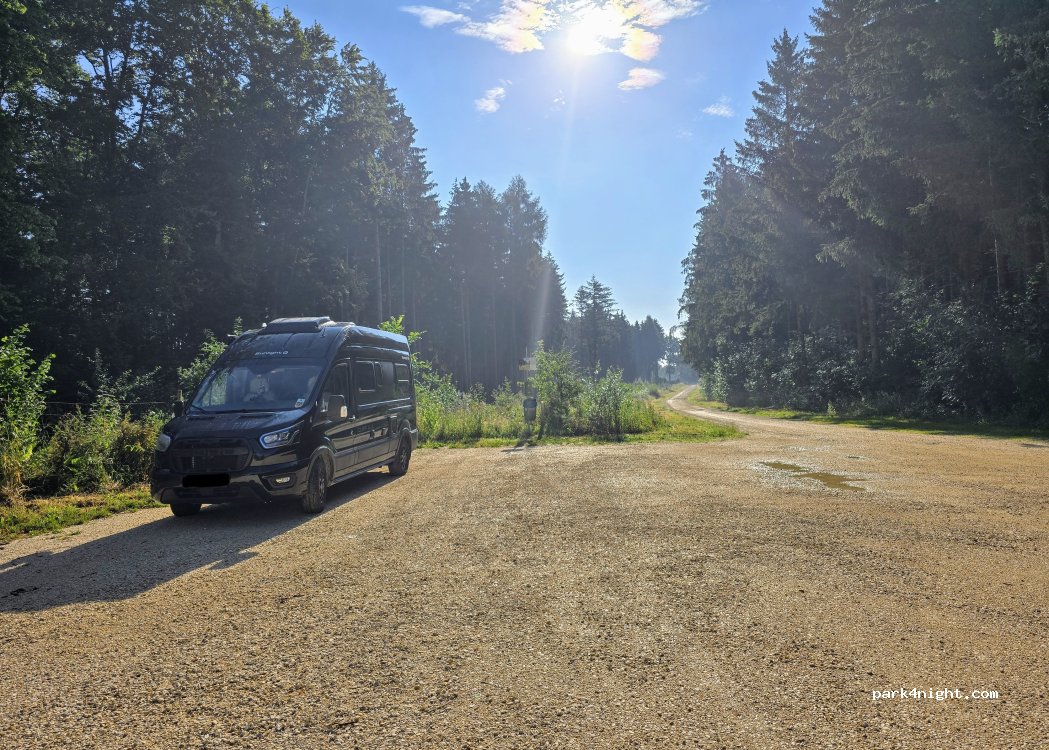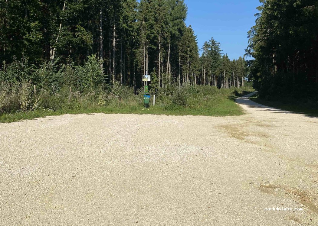 Ein sehr schöner auch bei Regenwetter anfahrbarer Waldparkplatz beim Sportgelände. Auch für Wohnmobile geeignet. Für 1 Nacht Ideal, wer autark stehen kann.