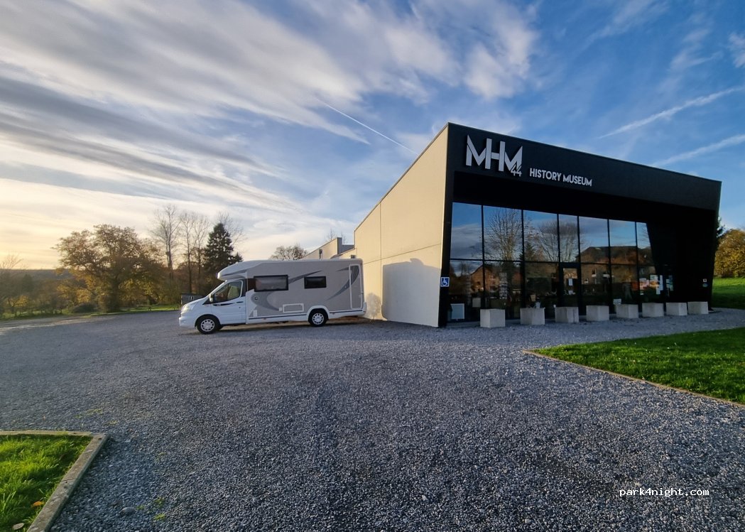 Mooie ruime parking langs het museum. Even aan de eigenaars toestemming gaan vragen om hier te mogen overnachten, was geen enkel probleem. Weinig last gehad van het verkeer enkel de haan als wekker. De dag erna nog een mooi bezoek gebracht aan het museum. Zeker een aanrader.