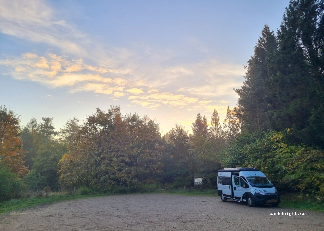 Schöner ruhiger Parkplatz. Ab und an fahren ein paar Autos die Straße entlang. Wem das nicht stört kann hier gut die Nacht verbringen. Keine Entsorgungsmöglichkeiten. Toller Wald um mit dem Hund spazieren zu gehen!