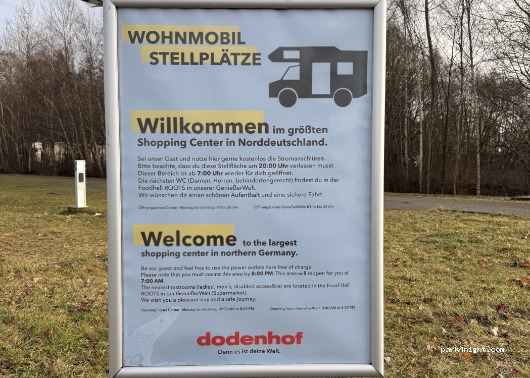 Auf dem Gelände des Dodenhofs. Der Platz reicht vollkommen aus, wenn man auf der Durchreise ist. Strom gibt es 24/7 kostenlos. Parken ist auf 8 bis 20 Uhr beschränkt. Danach werden die umliegenden Tore alle von einem Sicherheitsdienst verschlossen. Neben Warenannahme für Truckst. und Müllunternehmen, die morgens Container hin und her stapeln.