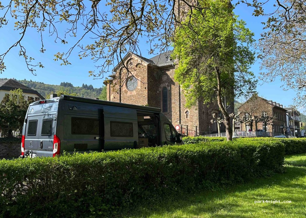 Free parking spaces along the river and the road to Cochem. Restaurants close by. The road becomes a bit loud in the morning. It might be difficult to find a spot in the high season. Lovely wide grass area to chill out. We spent a day and a night.