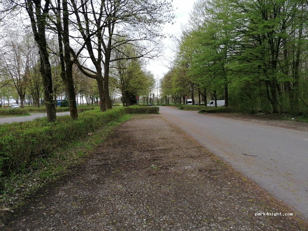 Large parking space with trees; very quiet during te night. The lake is just a few steps away.