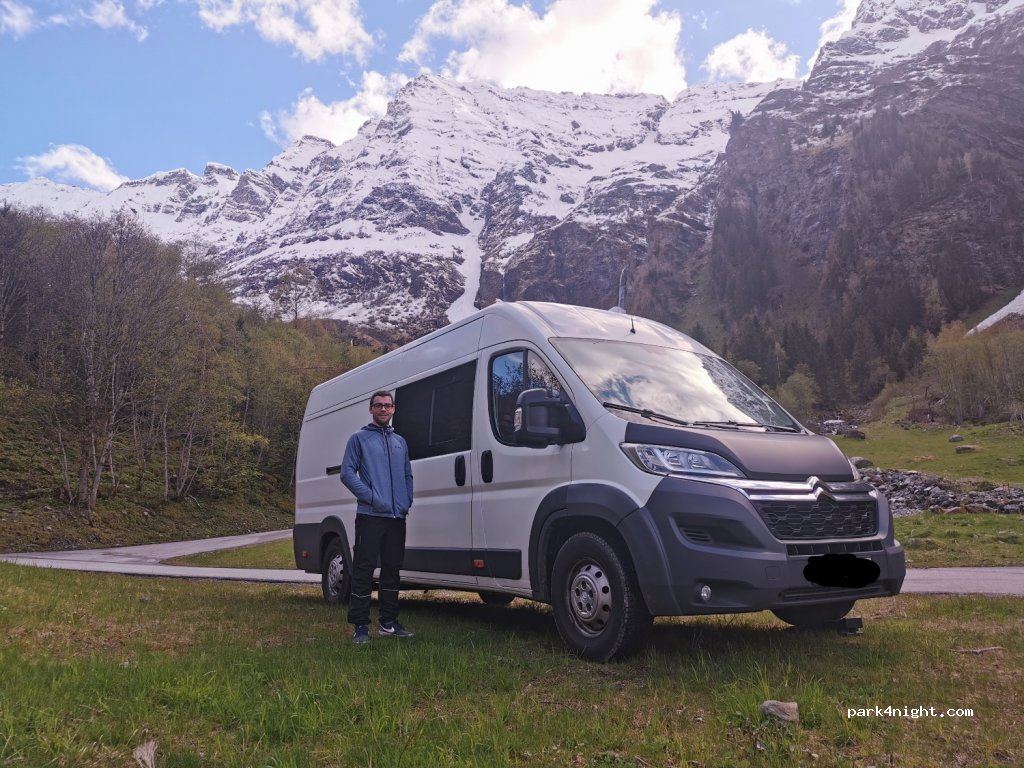 Good parking space for 2 vans / buses. Fantastic view of the mountain range. It is true that it is right next to the road. Highly recommended!