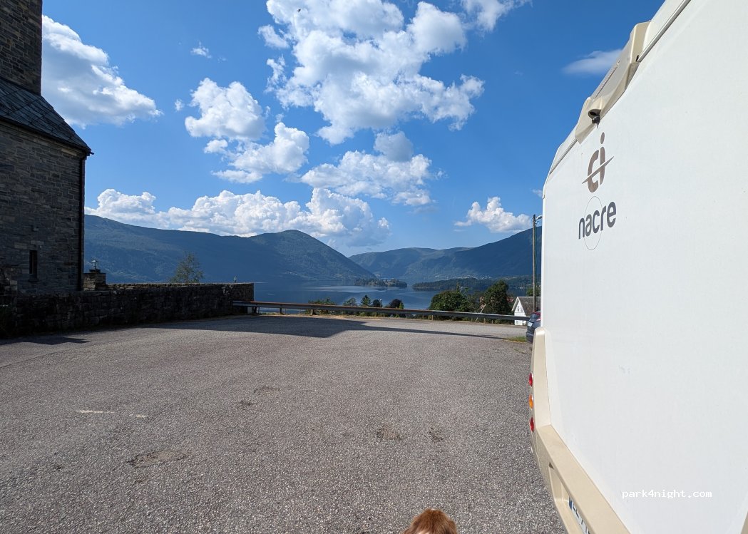 Very quiet place with a fantastic view over the fjord. It is at the end of a residential area, and it's fairly close to one house, but is still quite private. The neighbours are friendly and used to campers parking here. 5-6 campervans can easily fit in. It is the parking for the church, so it is better to leave before 10.30am on a Sunday. The local commodity shop is within walking distance.