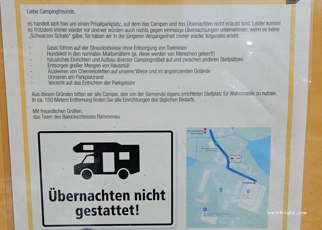 Ein ruhiger Parkplatz der ab 18 Uhr kostenfrei nutzbar ist. SAT Empfang an den mittleren Parkplätzen möglich. Man kann das Schloß Rammenau tagsüber besichtigen und von dort aus gibt es viele kleine Wanderwege zu erreichen. Sehr schön ist die Kirschallee die mit vielen Kirsch und Apfelbäumen zum Naschen einlädt.