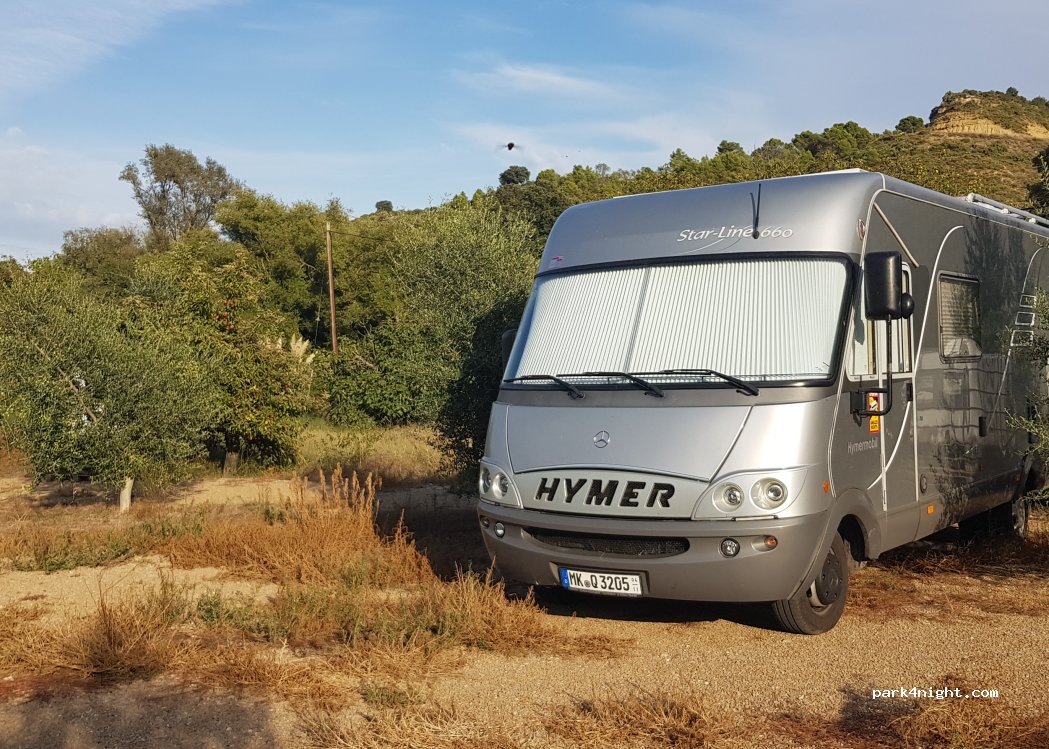 Bel endroit pour passer la nuit. Pas facile de se garer pour un véhicule de de 7m. Les places sont séparées par des oliviers, qui grandissent... La route est un bon réveil matin.