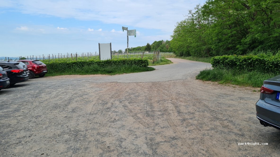 Schöner Ort am Waldrand und oberhalb von Weinfeldern. Ziemlich schräg (da dies kein offizieller Stellplatz ist, keine Keile verwenden). Etwas weiter im Wald ist eine Picknickbank, weit genug weg, um kein ‚campinghaftes Verhalten‘ zu erzeugen.
