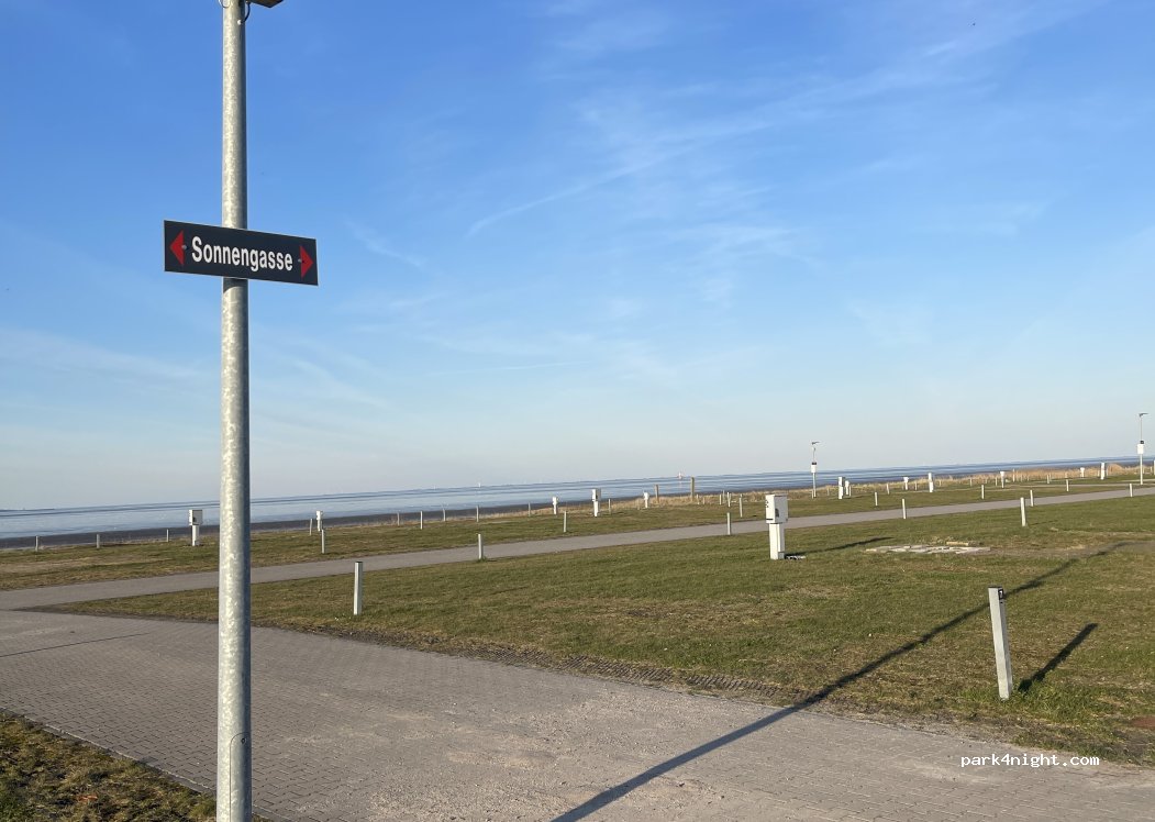 In der ersten Reihe steht man atemberaubend dicht am Jadebusen und genießt den Sonnenuntergang. Das ist teuer und das Geld wert. Der Rest ist auch wahr: Weitläufiger Platz mit vielen Dauercampern, laute Imbissbude mit Fleischgerichten aus den 70ern und Bargeldpflicht. Nächtliche Party und Lärm. Aber auch: Moderne Duschen. Brötchen auf dem Platz. Kostenlose Parkplätze nach dem Auschecken.
