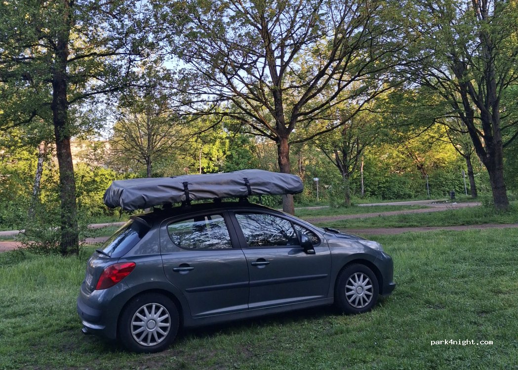 Large parking lot behind the Herrmann-Neuberger-Halle in front of the outdoor pool. It is a flat, graveled area on which small meadows have developed in part. There are plenty of shady spots between the trees. It's much quieter here than the RV parking space at the Völklinger Hütte.