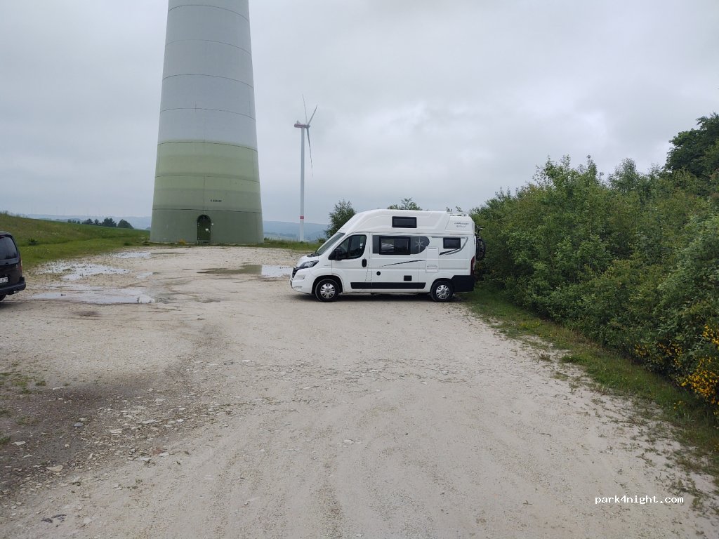 Grand parking pour randonneurs juste à côté d'une éolienne, le parking est merveilleusement calme, plat et le soir vous êtes tout seul.